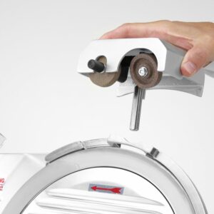 Eloxált alumínium ház. 0,3 LE-s léghűtéses motor, műanyag fedéllel védve. Az átlátszó biztonsági képernyő működés közben. Könnyen kivehető alkatrészek a gyors tisztítás érdekében. Biztonságos pengevédelem és beépített pengeélesítő. Döntött modell kiváló minőségű pengével. Pengeátmérő: 300 mm. A vágott termék becsült maximális átmérője: 210 mm. Fokozatmentesen állítható vágási vastagság, legfeljebb 13 mm. A penge a ház eltávolítása során rögzítve van a forgás ellen. 4 csúszásgátló műanyag láb. Tömeg: 24,5 kg.